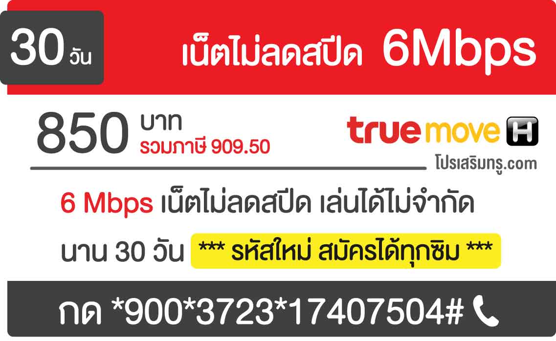 โปรเน็ตทรู 30 วัน ไม่ลดสปีด 6mbps 850 บาท 3723